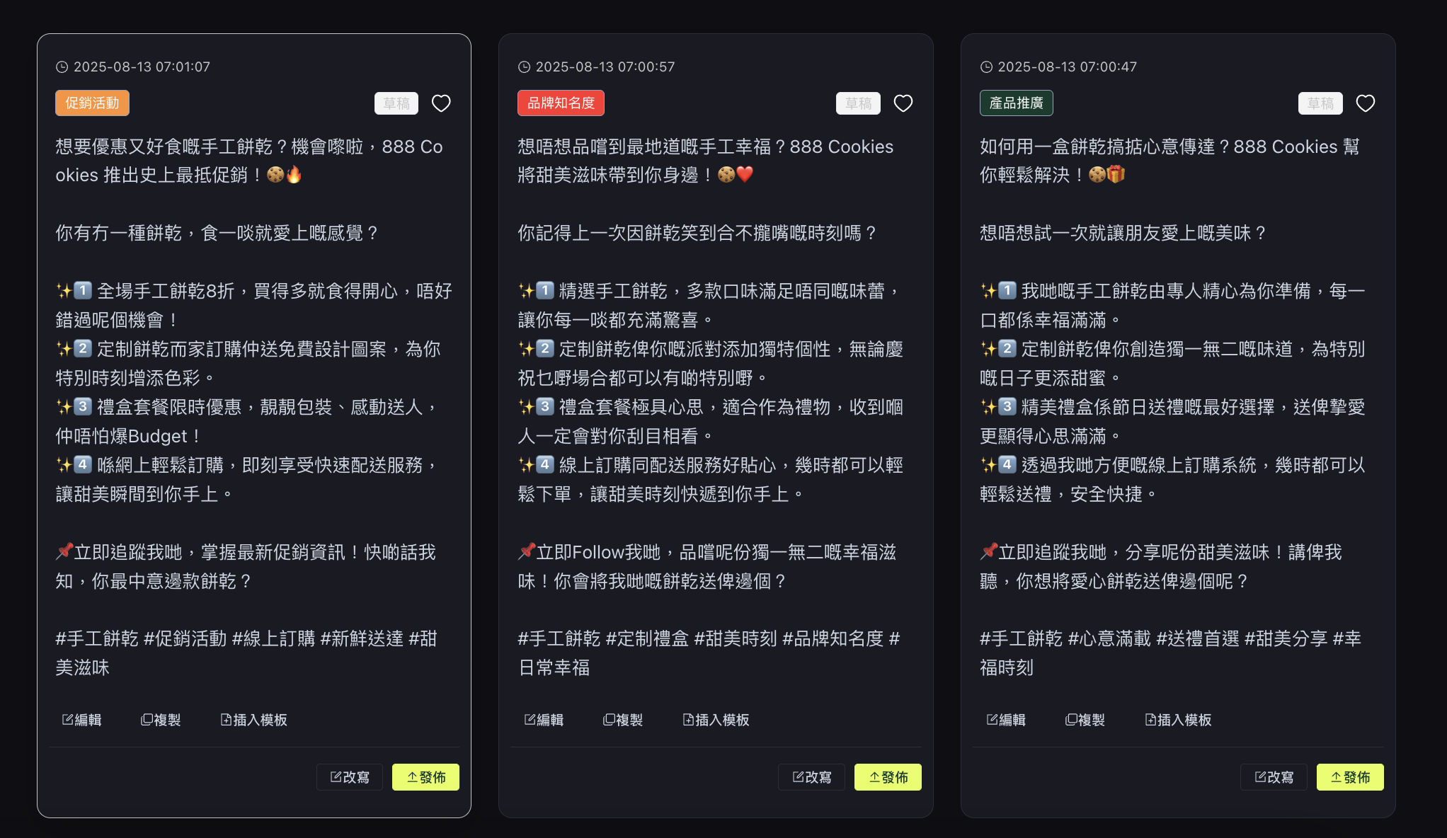 不會。每段內容都是根據您的品牌與產品賣點、語氣、主題即時生成,確保專屬、原創,避免內容雷同。您亦可自由對文案進行修改,確保內容更貼合品牌風格。